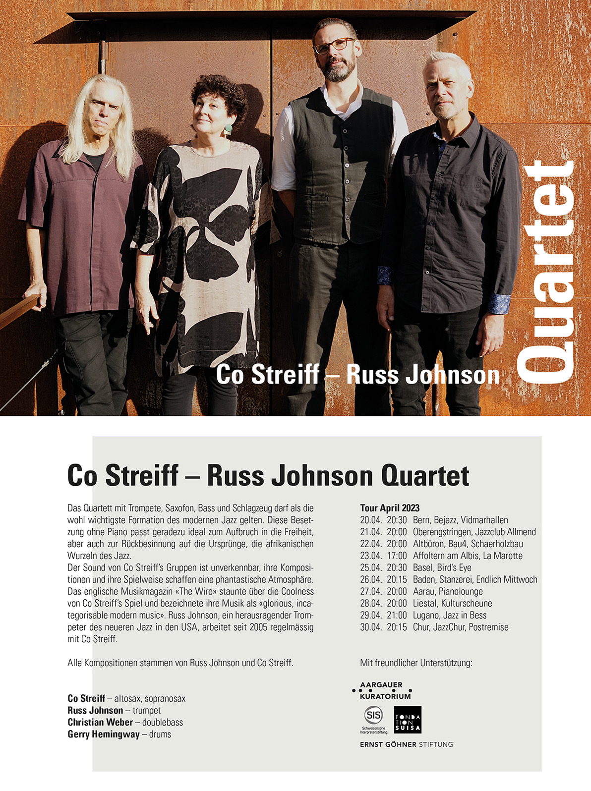 Co Streiff/Russ Johnson Quartet Co Streiff saxophones Russ Johnson trumpet Christian Weber bass Gerry Hemingway drums 20.01.24 Genève - AMR 21.01.24 St. Gallen - Kleinaberfein 24.01.24 Basel - Musikwerkstatt 25.01.24 Zürich - Filmpodium 26.01.24 Schinznach - Aula 28.01.24 Winterthur - Feilenhauer |
