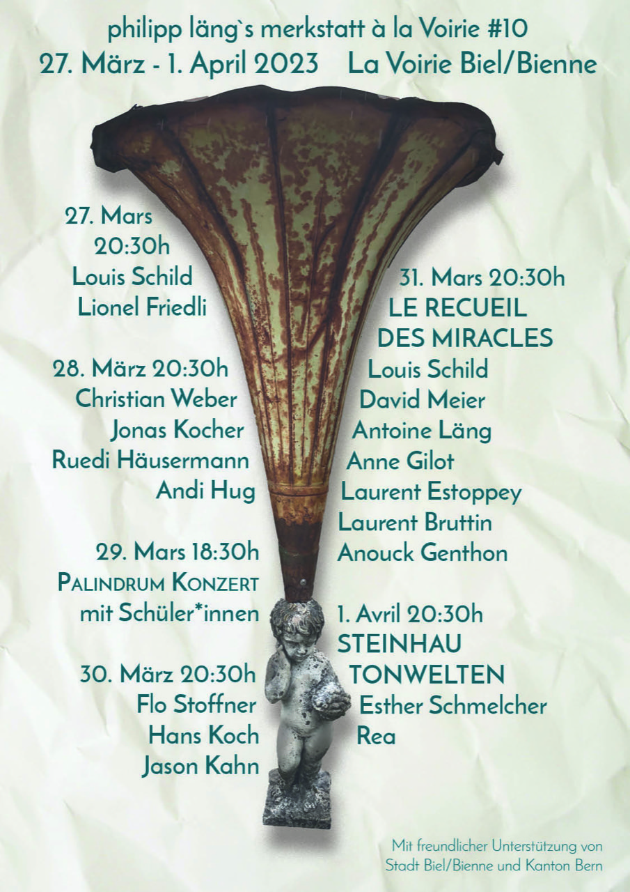 | 28.03.23 | 20.30 | merkstatt à la Voirie Ruedi Häusermann clarinet, flute Ändu Hug drums Jonas Kocher accordion Philipp Läng objects, sound installation Christian Weber bass Merkstatt - La Voirie, Biel Flyer |