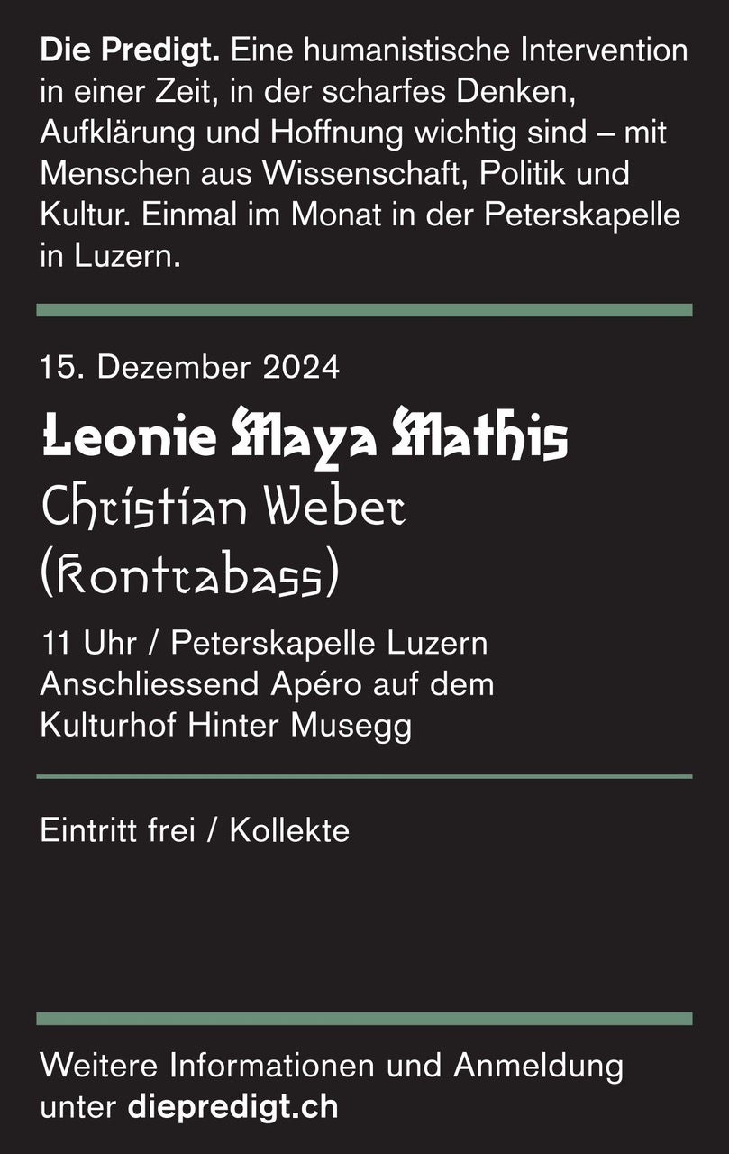 | 15.12.24 | 11.00 | Die Predigt Leonie Maya Mathis words & thoughts Christian Weber bass Die Predigt - Peterskapelle, Luzern Flyer |