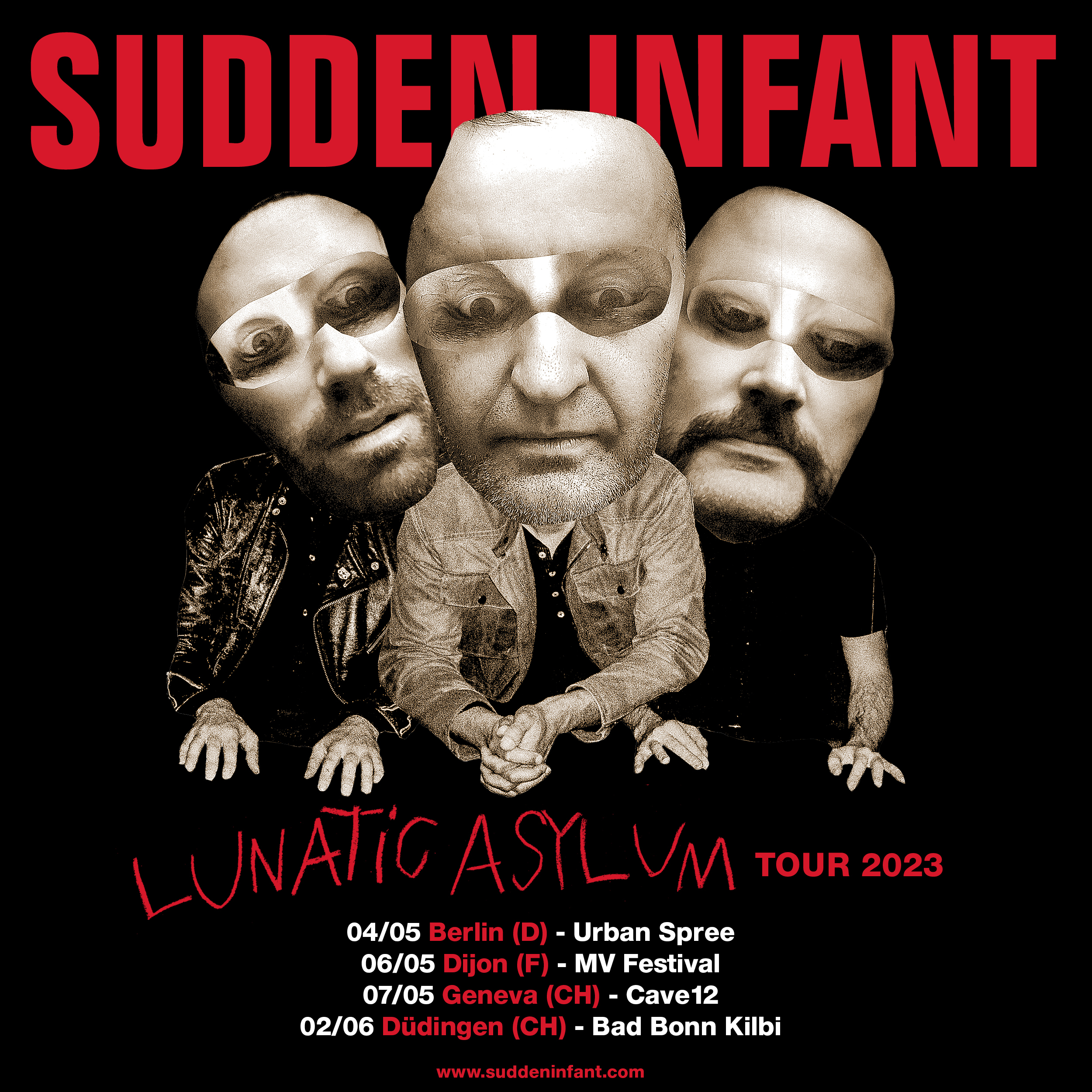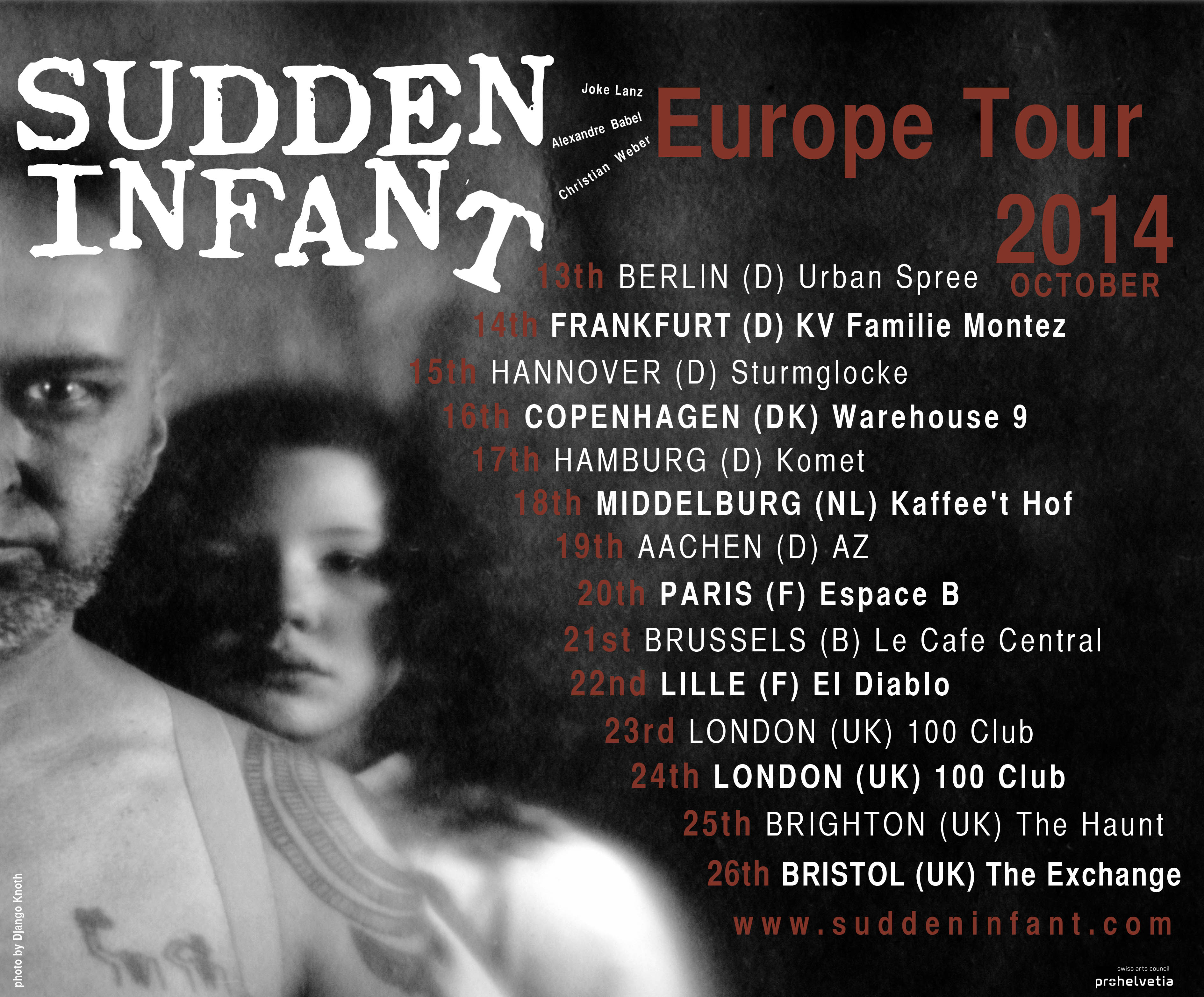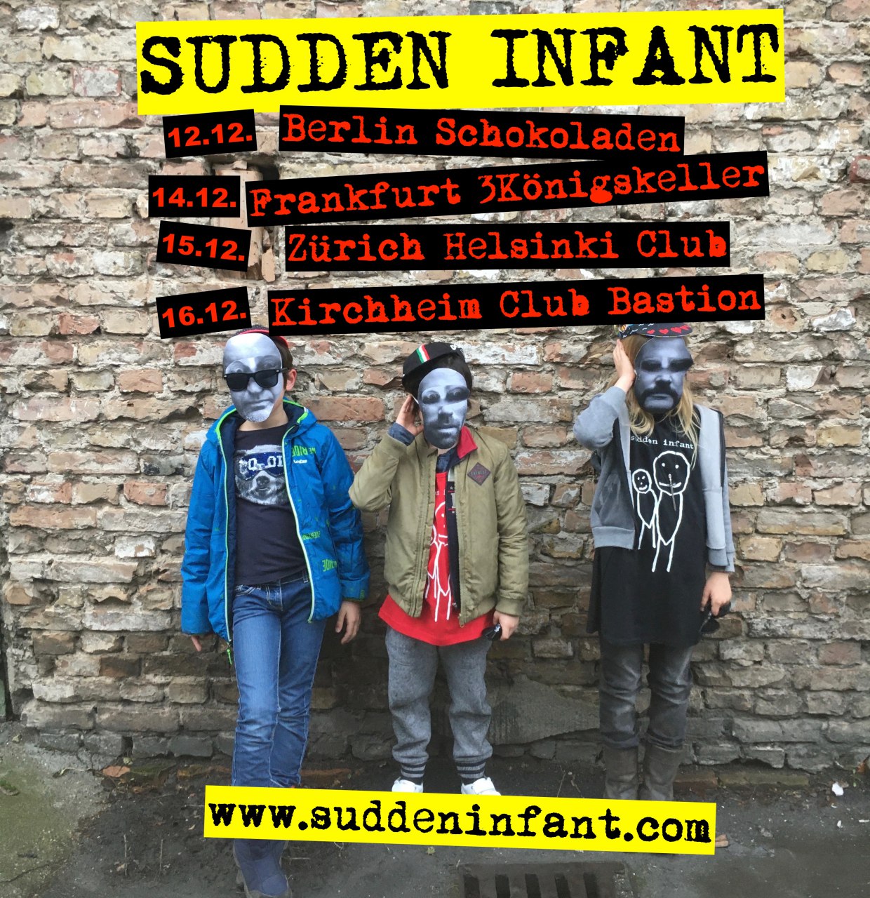 Sudden Infant Joke Lanz vocal, electronics Christian Weber bass Alexandre Babel drums 12.12.23 Berlin - Schokoladen 14.12.23 Frankfurt - 3Königskeller 15.12.23 Zürich - Helsinki Klub 16.12.23 Kirchheim unter Teck (D) - Club Bastion Flyer |