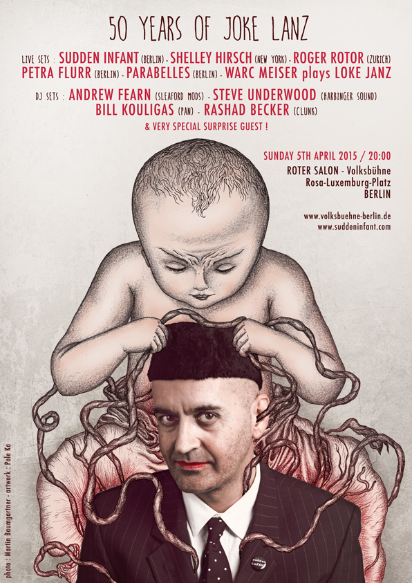 | 18.04.09 | 21.00 | 20 Years of SUDDEN INFANT Celebration Party Ushi Hupe(Berlin) Family Battle Snake (London) Christian Weber (Zurich) Raionbashi (Berlin) Tom Smith (Miami) Rashad Becker (Berlin) Dick Tourette (Lucerne) Jorge Sanchez-Chiong (Vienna) Sudden Infant Family (Zurich/Berlin) Runzelstirn & Gurgelstock (Osaka) Der Harbinger Sound Plastic Punk Explosion(Nottingham) DJ Eric B w/o Rakim (Berlin) & very special guests! Ausland, Berlin |