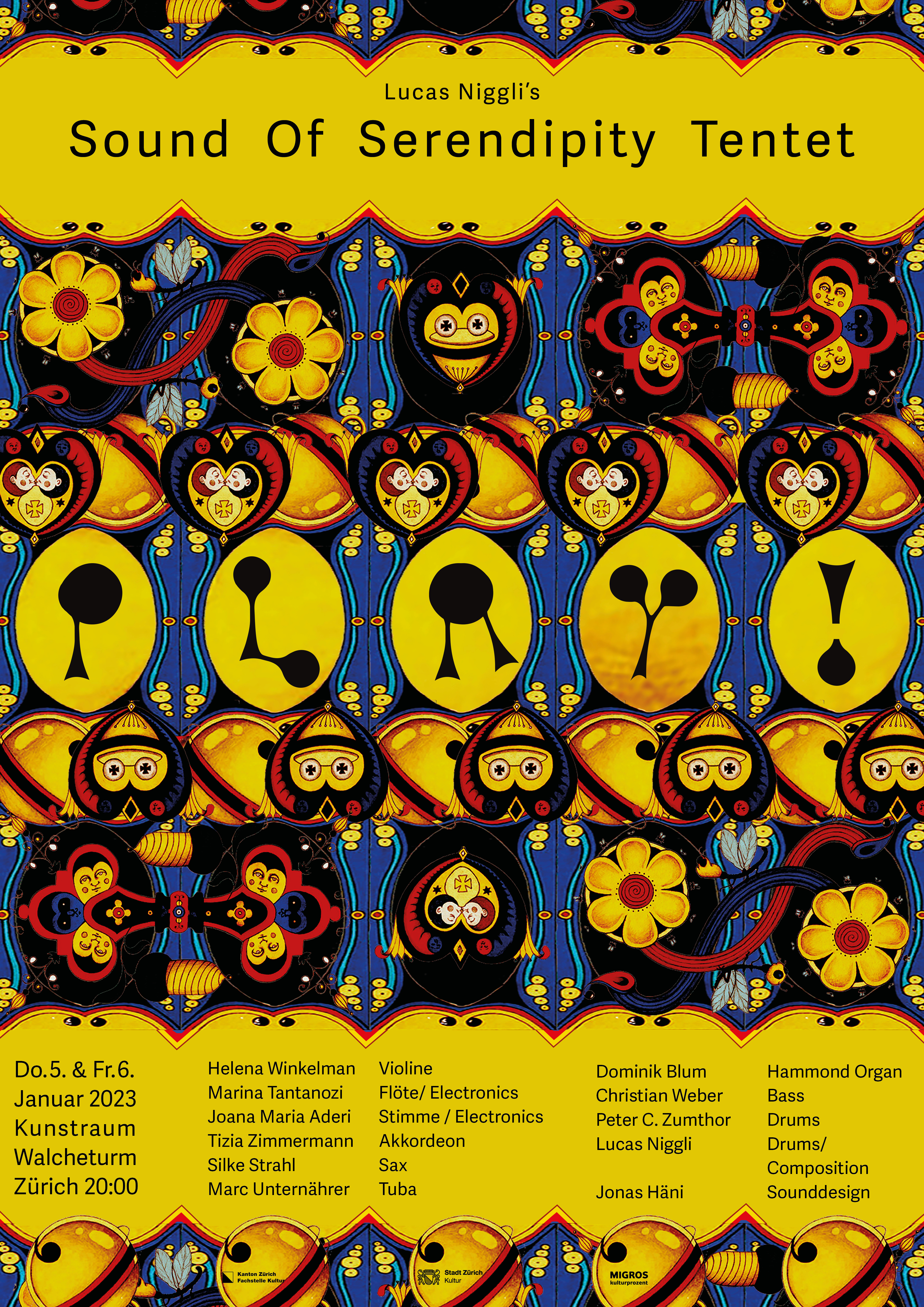 20.00 | Sound of Serendipity Tentet «Play!» Helena Winkelman violin Marina Tantanozi flute, electronics Joana Maria Aderi voice, electronics Tizia Zimmermann accordion Silke Strahl saxophone Marc Unternährer tuba Dominik Blum hammond organ Christian Weber bass Peter Conradin Zumthor drums Lucas Niggli drums, composition Jonas Häni sounddesign Walcheturm, Zürich Flyer |
