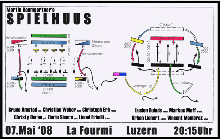 | 07.05.08 | 20.15 | Martin Baumgartner's Spielhuus Christy Doran guitar Markus Muff trombone Christoph Erb reeds Lucien Dubuis reeds Lionel Friedli drums Bruno Amstad vocals Dario Sisera percussion Vincent Membrez keyboards Urban Lienert e-bass Christian Weber bass Martin Baumgartner prompter Flyer La Fourmi, Luzern |